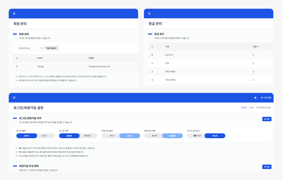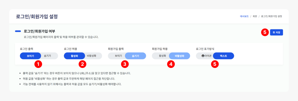 [ 관리자 페이지 > 회원 > 로그인/회원가입 설정 ]