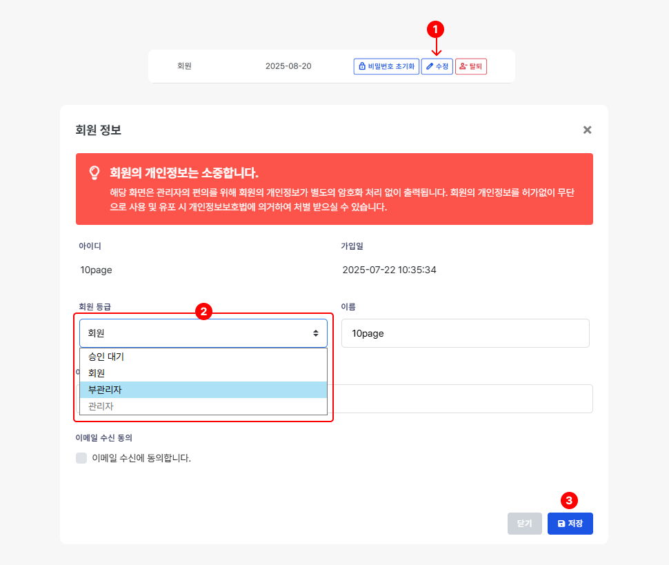 목록에서 변경하고자 하는 회원의 우측
